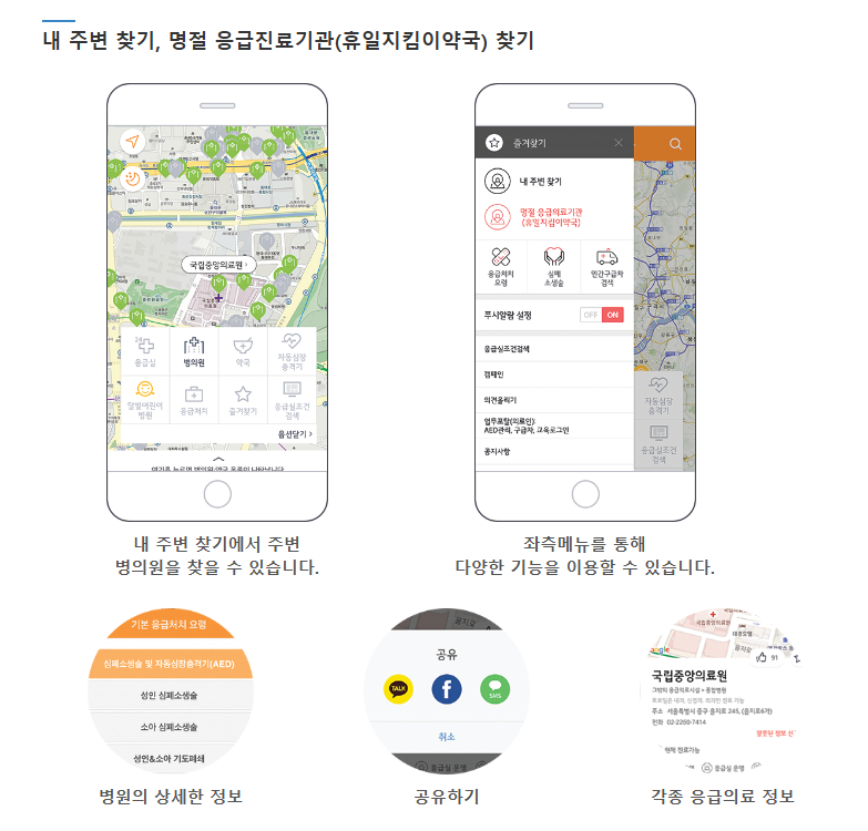 이젠 앱을 다운받으면 병의원, 응급실, 민간 구급차, 문여는 약국 정보를 모두 찾아볼 수 있습니다.