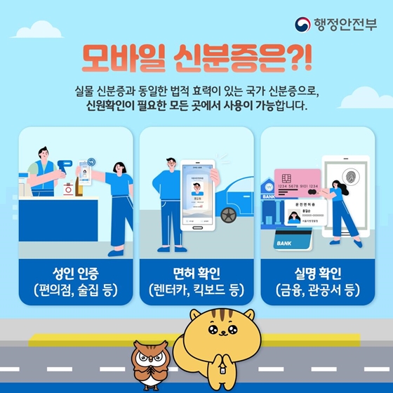 대표적인 모바일 신분증에는 운전면허증, 주민등록증이 있습니다. (단, 병원에서는 모바일 건강보험증도 사용 가능)