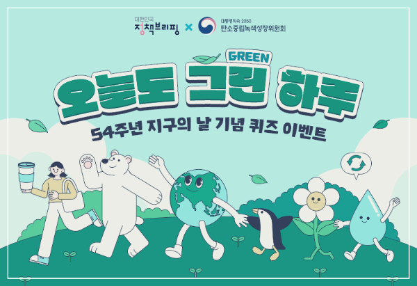 매월마다 환경기념일이 있다는 사실 알고 계신가요? 4월에는 식목일과 지구의 날이 있습니다. 올해 4월 22일 지구의 날은 54번째 기념일을 맞이하게 되었습니다. 탄소중립포인트 녹색생활실천 제도에 관심을 갖고 참여하도록 이벤트를 준비했으니 참여하셔서 환경도 지키고 상품도 받으세요.