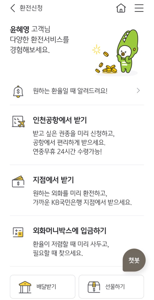 전체메뉴 > 외환 > 환전 > 환전신청 >「인천공항에서 받기」